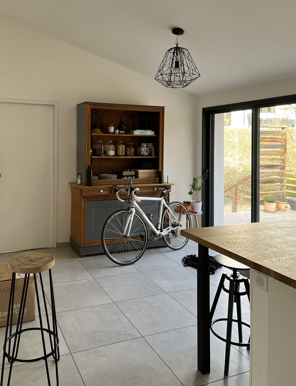 L’entrée a été placée contre-intuitivement à l’arrière de la maison, dans la partie haute. L’organisation interne a été complétement « retournée ». L’appentis a été surélevé pour être de plain-pied avec le salon, et généreusement percé pour accueillir la cuisine, ouvrant largement la maison sur le jardin.