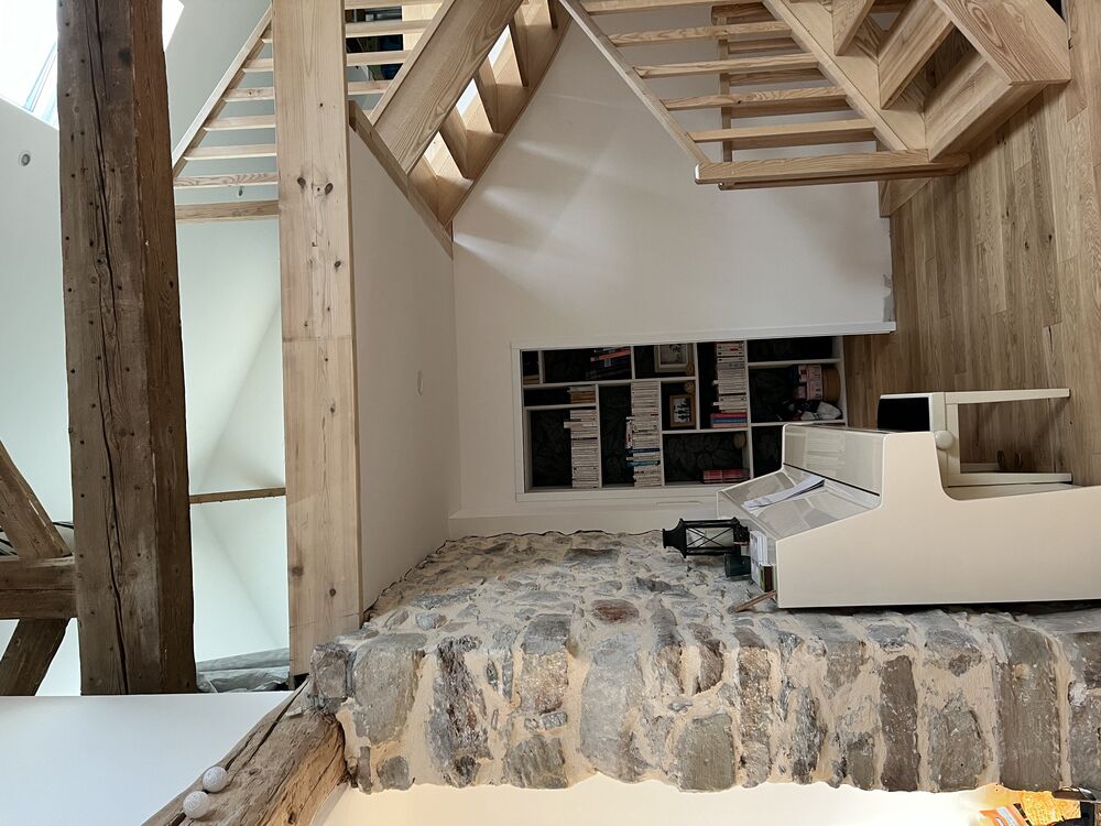 Un bureau sous les combles, en mezzanine du séjour, offre une perspective traversante