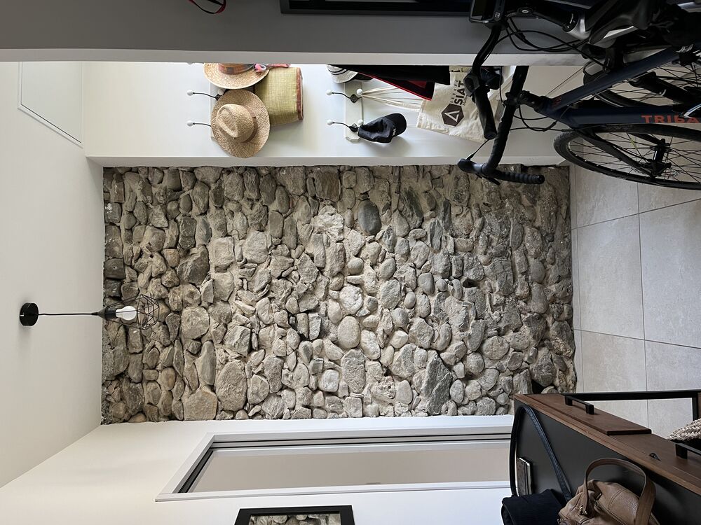 Les circulations verticales ont été regroupées au sein d’un escalier central qui dessert les 3 niveaux et s’appuie sur des murs en pierres apparentes découverts lors du curage.